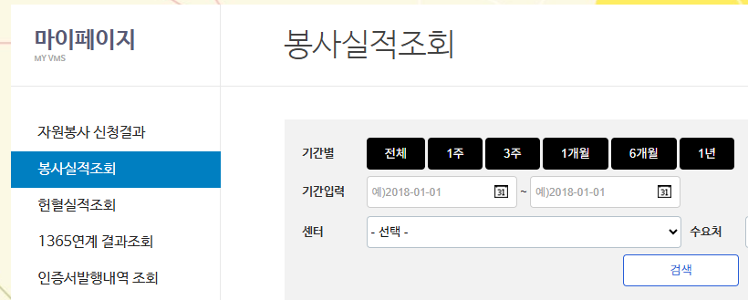 단, 1365자원봉사포털 시스템에 등록되어있는 과거 봉사실적은 확인 불가