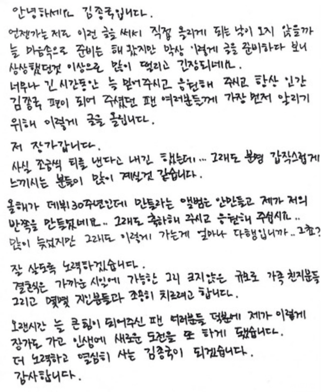 2025년 8월 18일, 가수 김종국(49)이 팬카페에 직접 손편지를 올리며 결혼을 공식 발표했습니다.