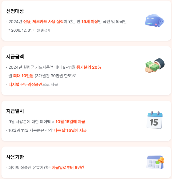 - 대상: 만 19세 이상, 2024년 카드 사용 이력이 있는 대한민국 국민 및 외국인