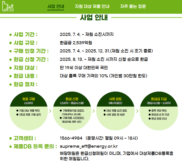 - 2025년 8월 13일~ 재원소진시까지 ‘으뜸효율 환급사업 시스템’ 접속