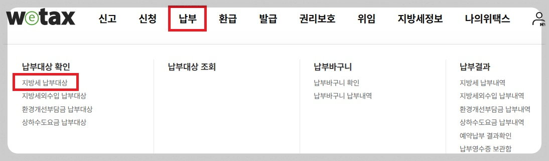 - 상단 메뉴 ‘납부 → 납부대상확인 → 지방세 납부대상' 클릭