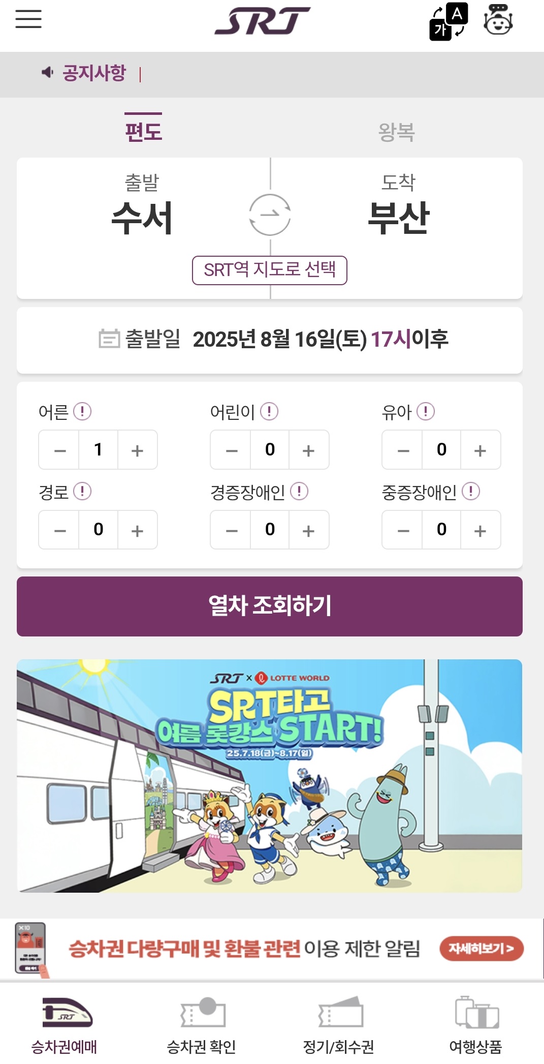 SRT는 환승 기능 미지원 → 각각 따로 예매해야 합니다.